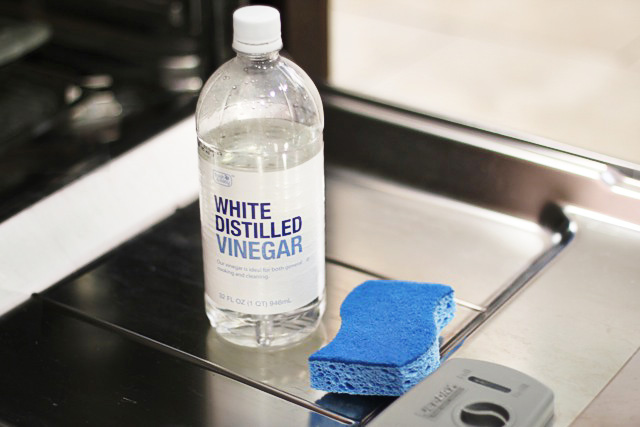 You will need dish soap, white vinegar, baking soda, a sponge, and an old toothbrush.